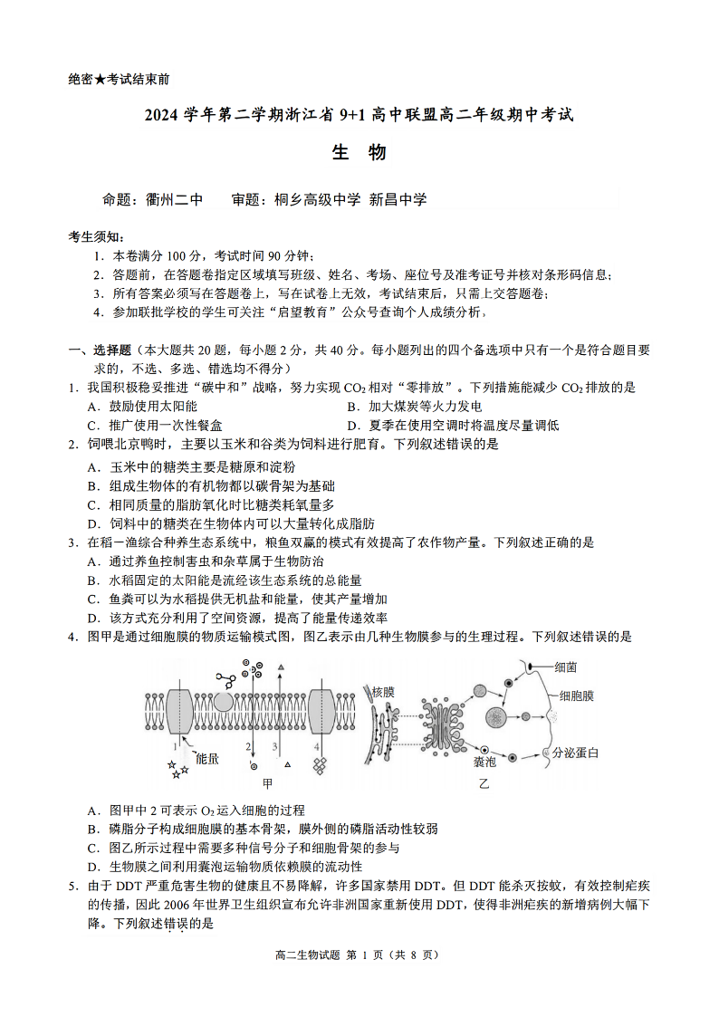 浙江省9+1联盟2024学年高二第二学期期中联考 生物.pdf