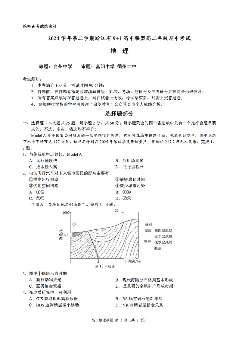 浙江省9+1联盟2024学年高二第二学期期中联考 地理.pdf