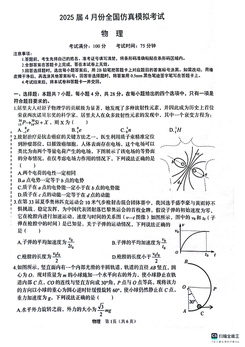 陕西省榆林市2025届4月份高三全国仿真模拟考试 物理.pdf