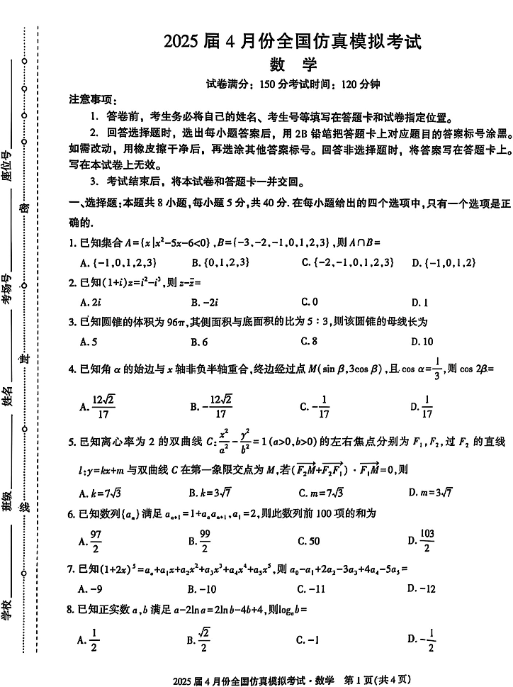 陕西省榆林市2025届4月份高三全国仿真模拟考试 数学.pdf