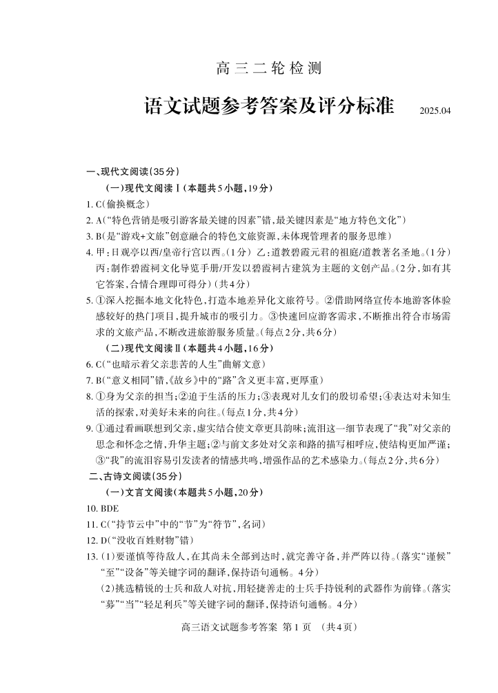 山东省泰安市2025届高三二轮检测 语文答案.pdf
