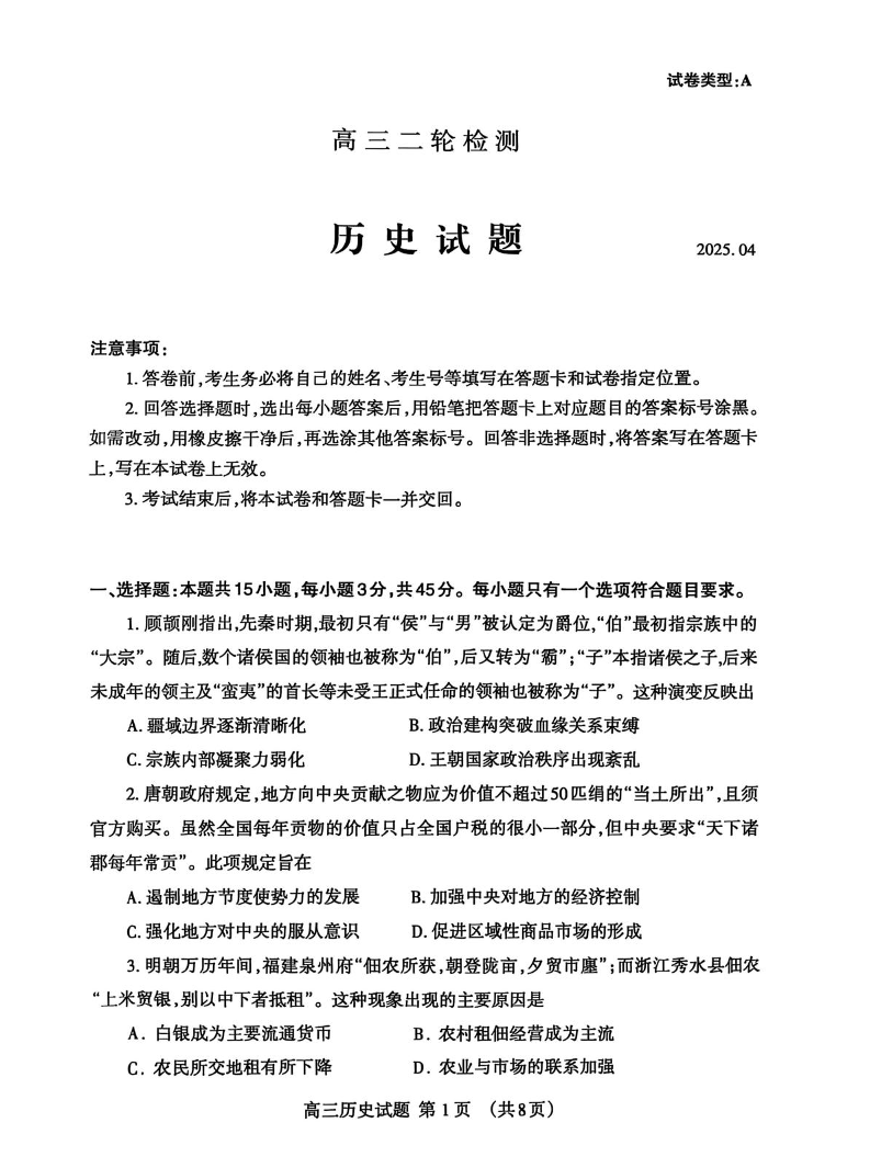 山东省泰安市2025届高三二轮检测 历史.pdf