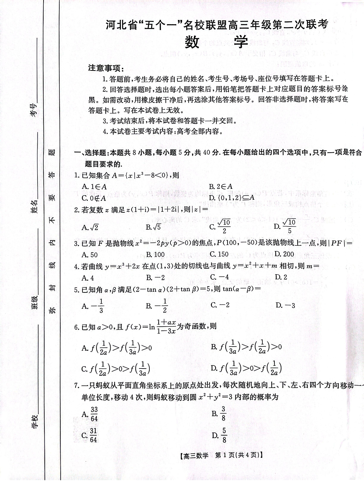 河北省“五个一”名校联盟2025届高三年级第二次联考 数学(含答案).pdf