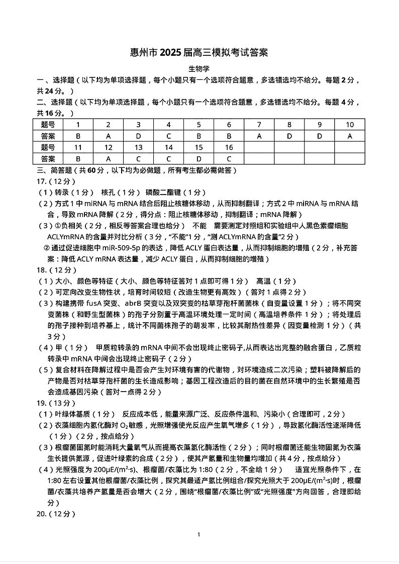 惠州市2025届高三模拟考试 生物答案.pdf
