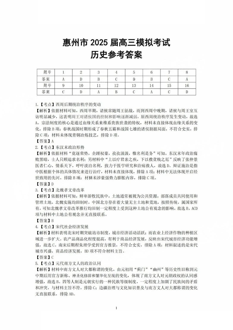 惠州市2025届高三模拟考试 历史答案.pdf