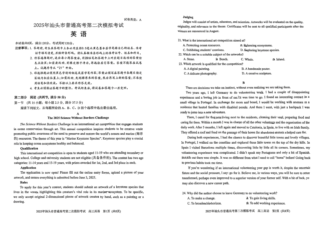 2025年汕头市普通高考第二次模拟考试 英语.pdf