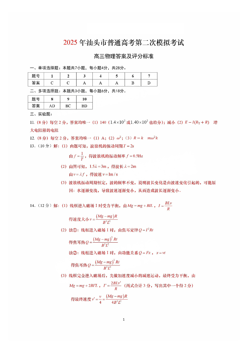2025年汕头市普通高考第二次模拟考试 物理答案.pdf