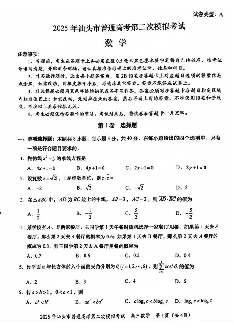 2025年汕头市普通高考第二次模拟考试 数学.pdf