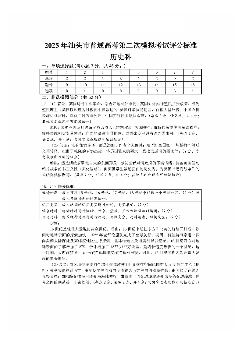 2025年汕头市普通高考第二次模拟考试 历史答案.pdf