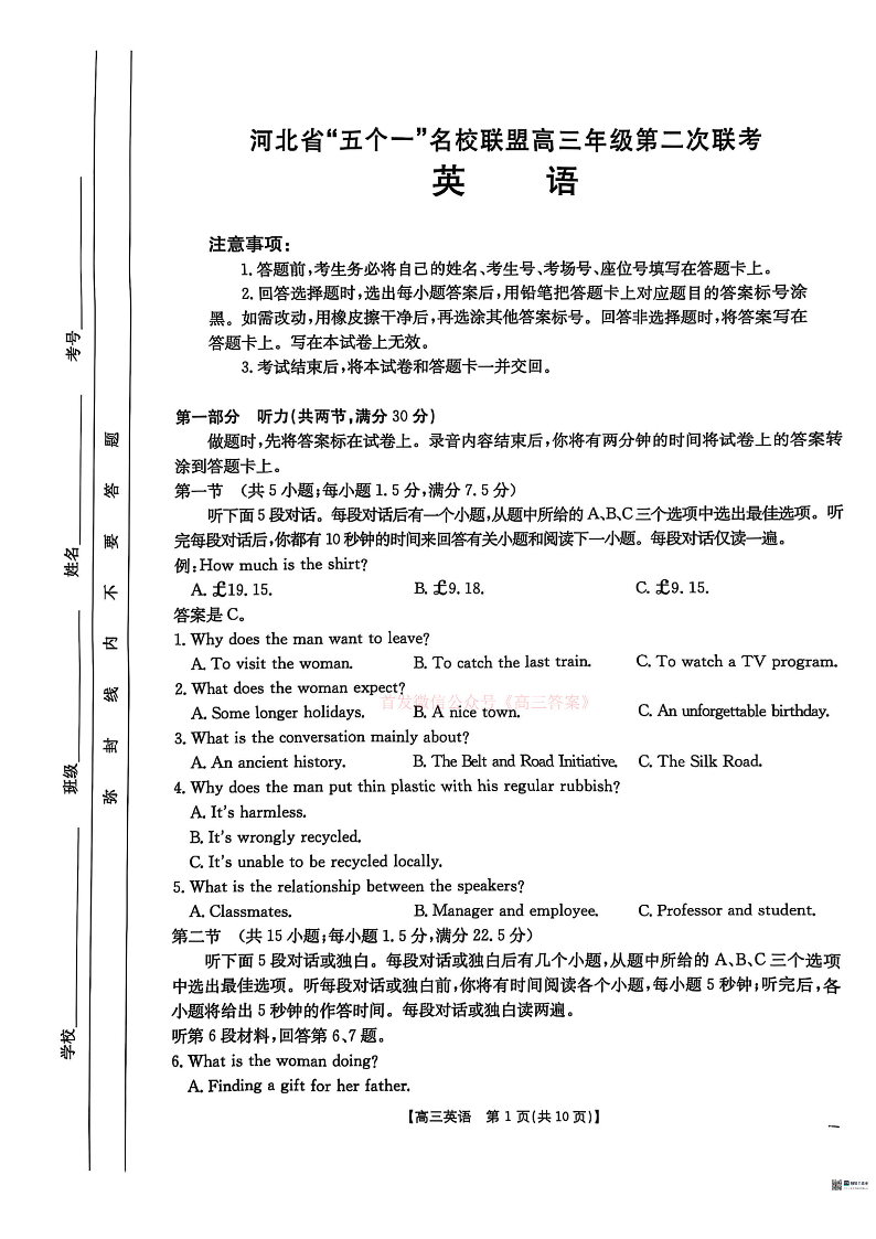 河北省“五个一”名校联盟2025届高三年级第二次联考 英语.pdf