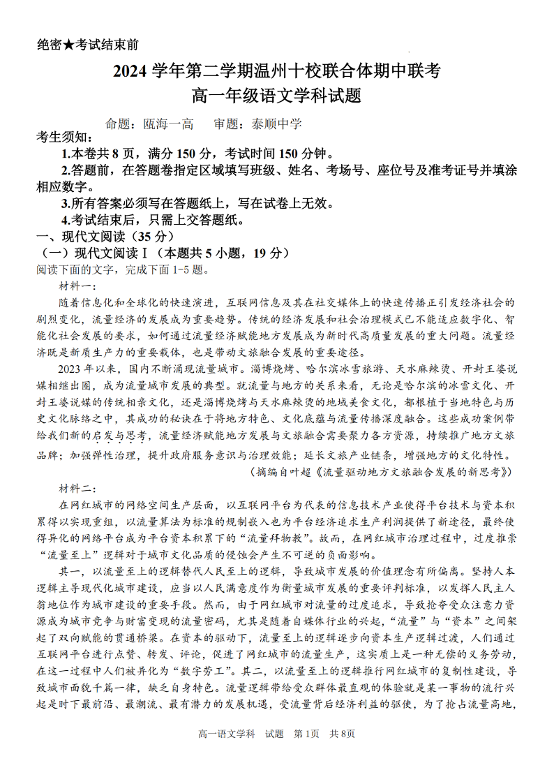 浙江省温州十校联合体2024学年高一第二学期期中联考 语文.pdf