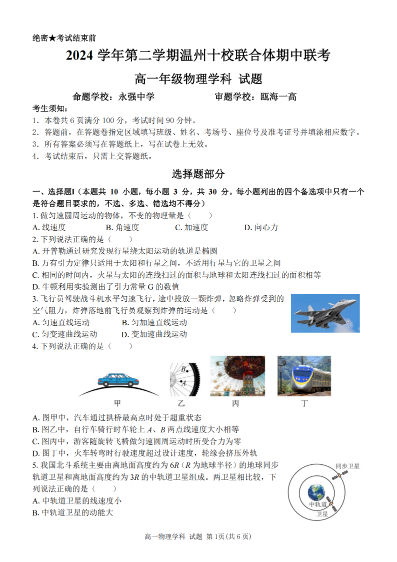 浙江省温州十校联合体2024学年高一第二学期期中联考 物理.pdf