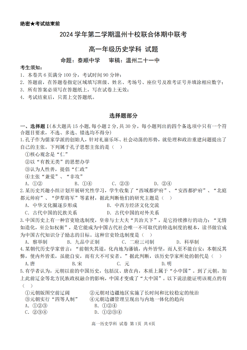 浙江省温州十校联合体2024学年高一第二学期期中联考 历史.pdf