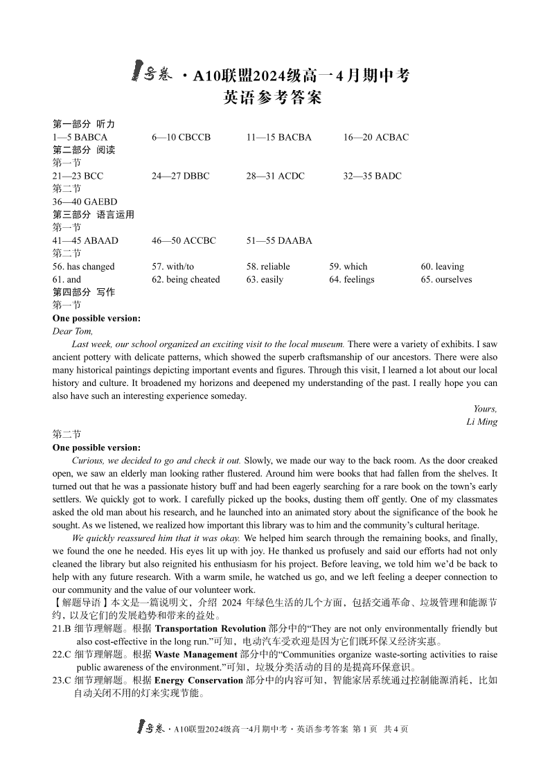 1号卷·A10联盟2024级高一4月期中考 英语答案.pdf