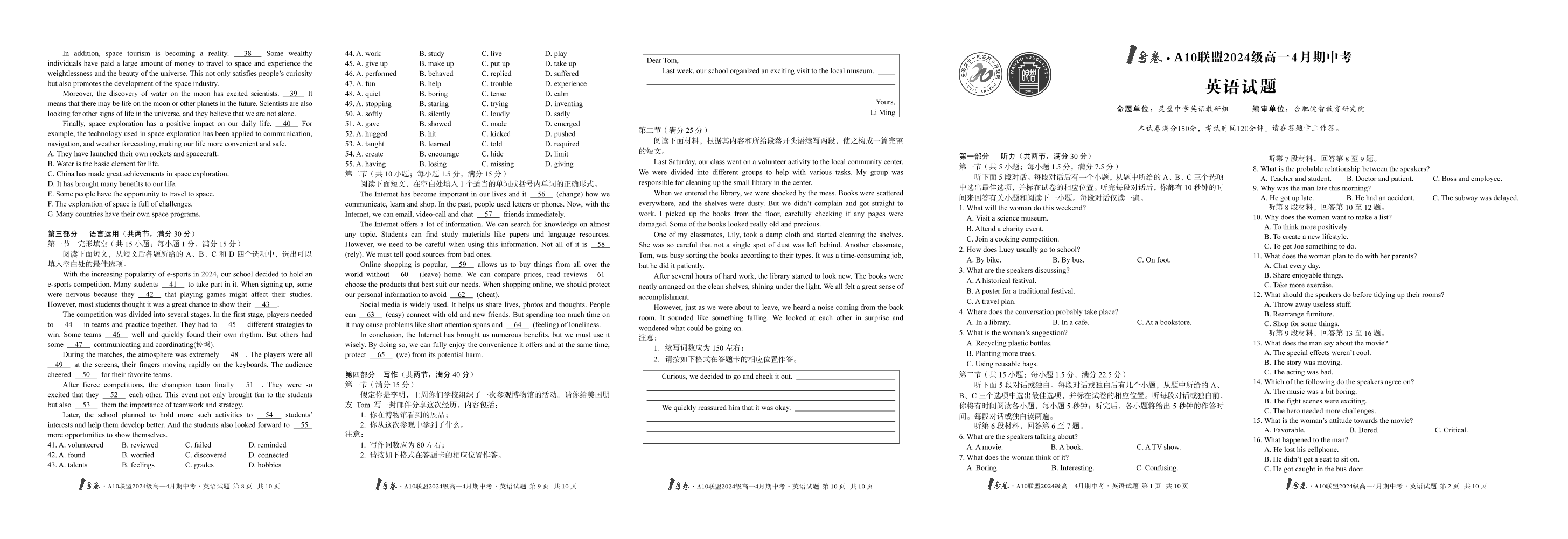1号卷·A10联盟2024级高一4月期中考 英语.pdf