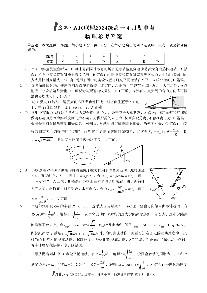 1号卷·A10联盟2024级高一4月期中考 物理答案.pdf
