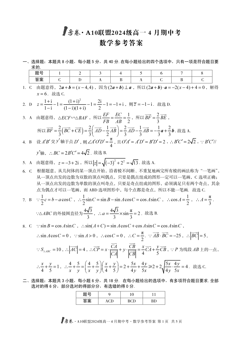 1号卷·A10联盟2024级高一4月期中考 数学答案.pdf