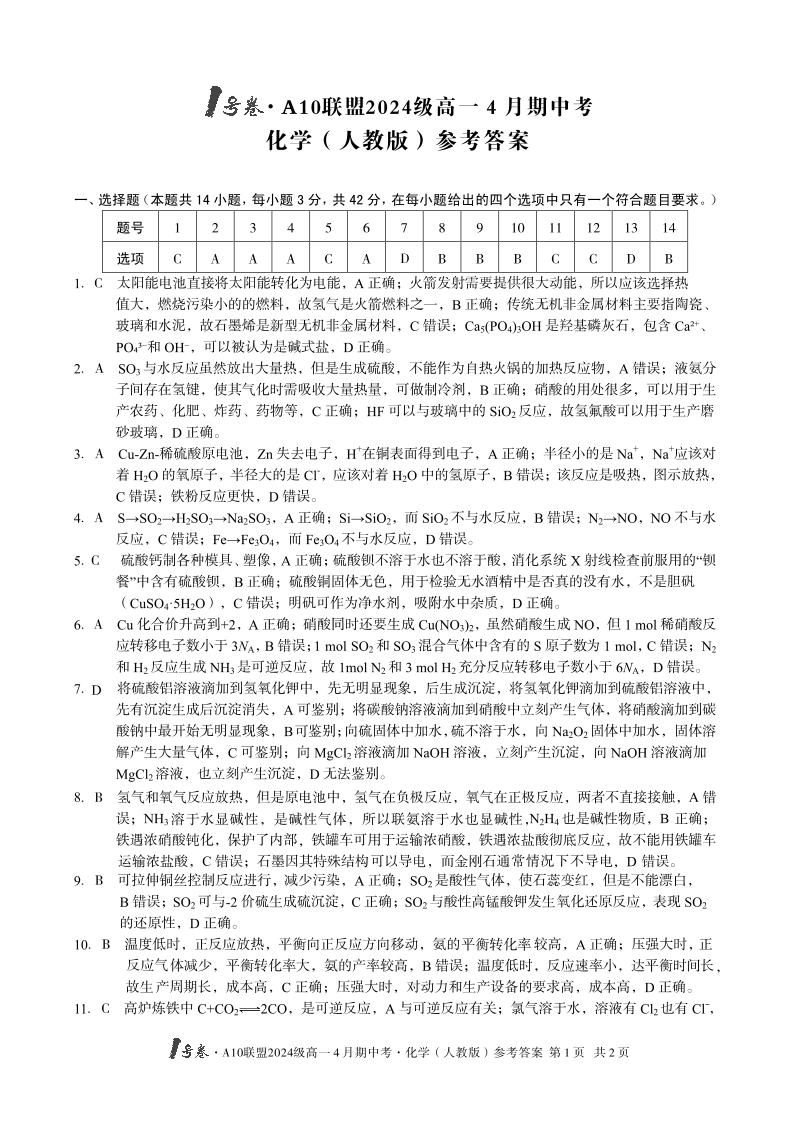 1号卷·A10联盟2024级高一4月期中考 化学(人教版)答案.pdf