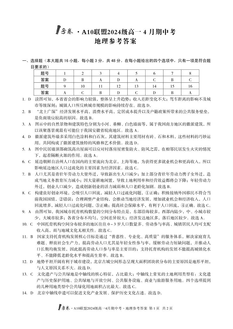 1号卷·A10联盟2024级高一4月期中考 地理答案.pdf
