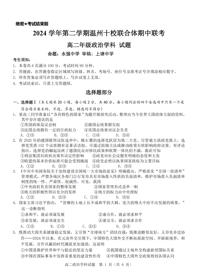 温州十校联合体2024学年高二第二学期期中联考 政治.pdf