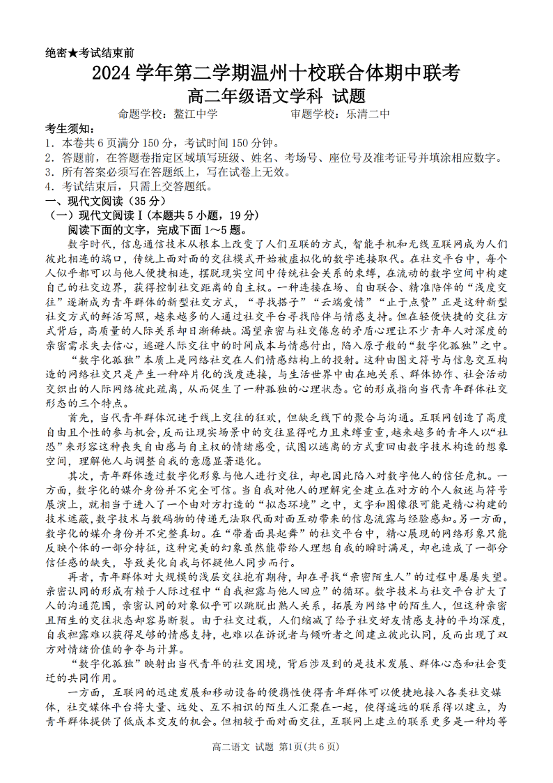 温州十校联合体2024学年高二第二学期期中联考 语文.pdf
