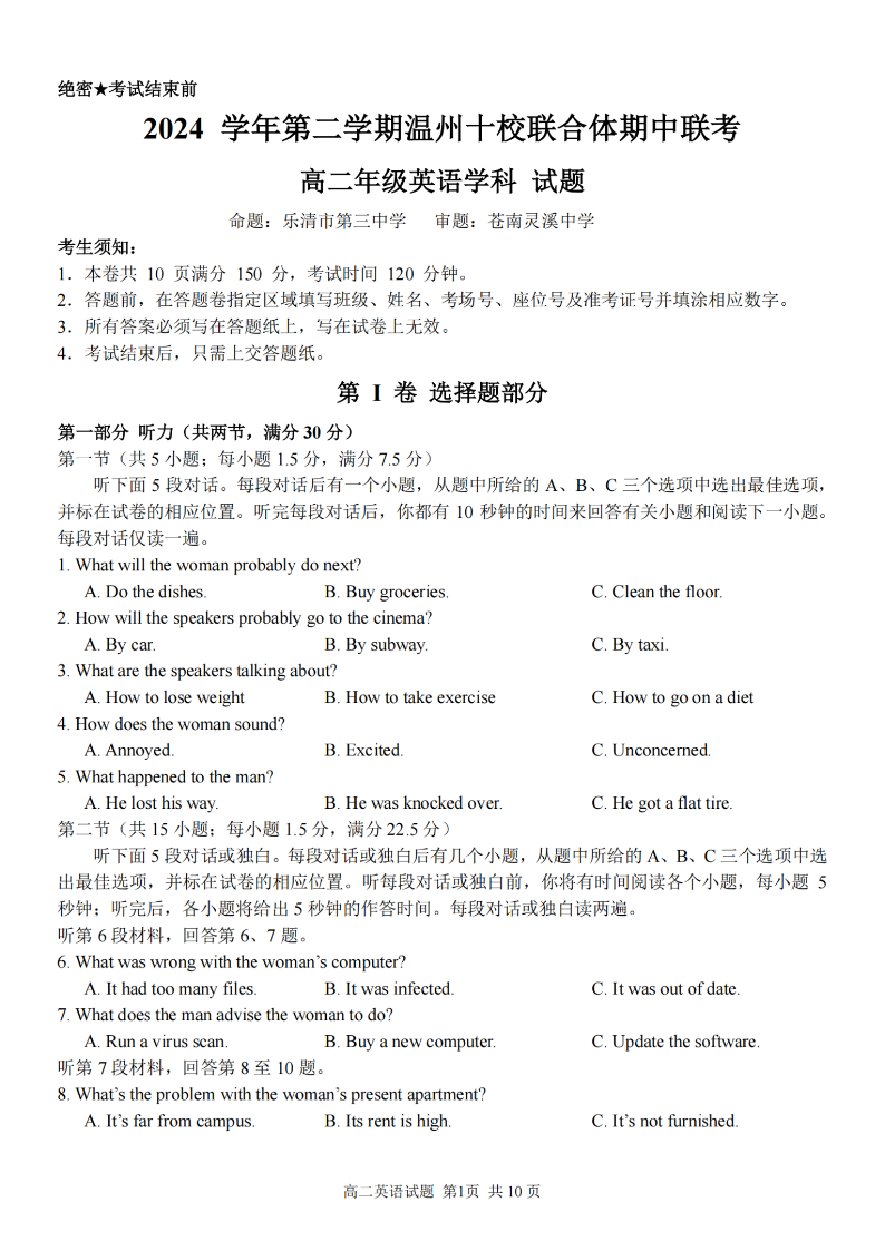 温州十校联合体2024学年高二第二学期期中联考 英语.pdf