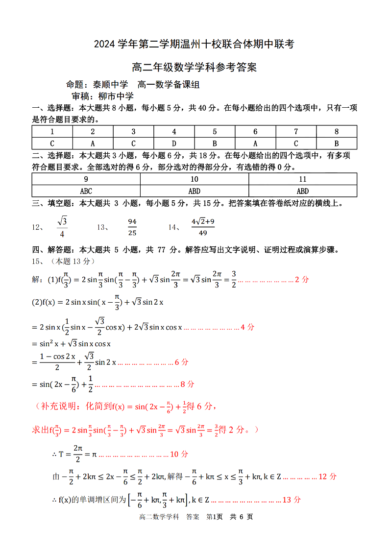 温州十校联合体2024学年高二第二学期期中联考 数学答案.pdf