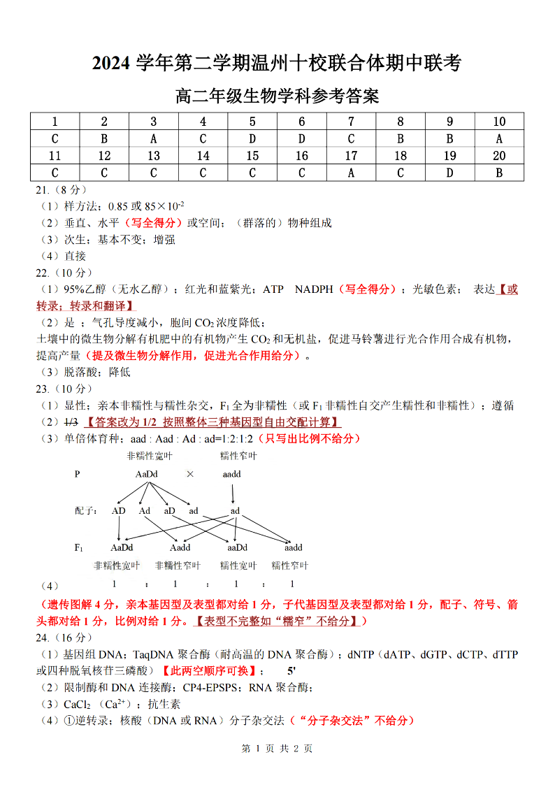 温州十校联合体2024学年高二第二学期期中联考 生物答案.pdf