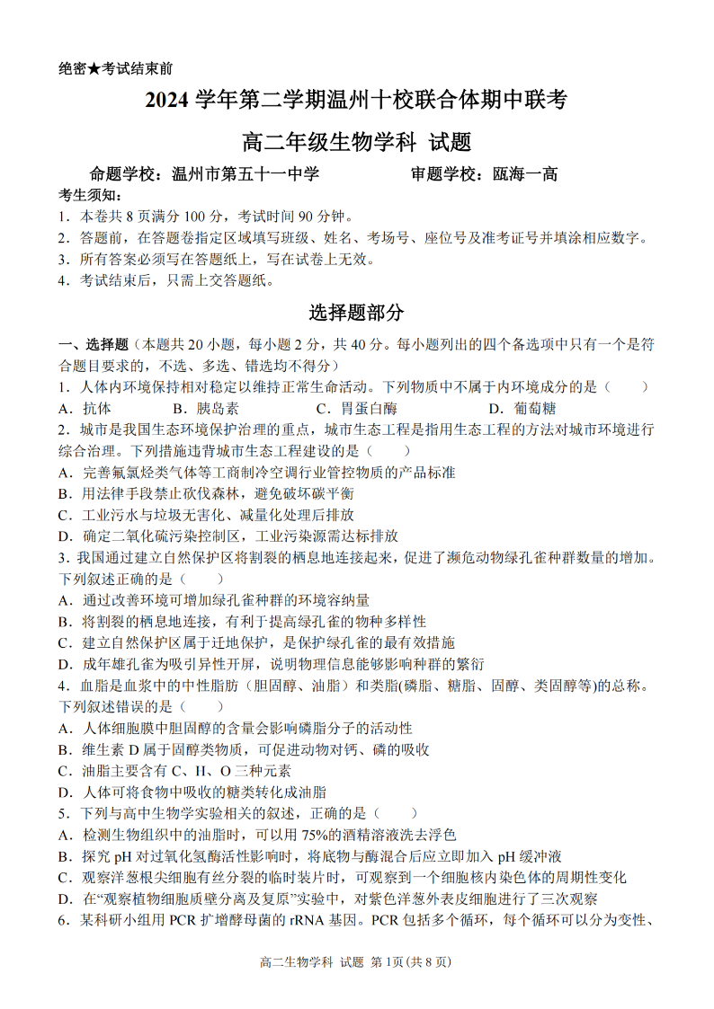 温州十校联合体2024学年高二第二学期期中联考 生物.pdf