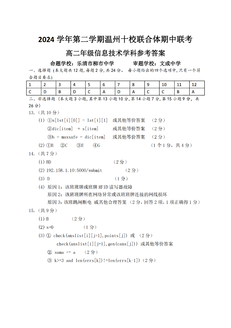 温州十校联合体2024学年高二第二学期期中联考 技术答案.pdf