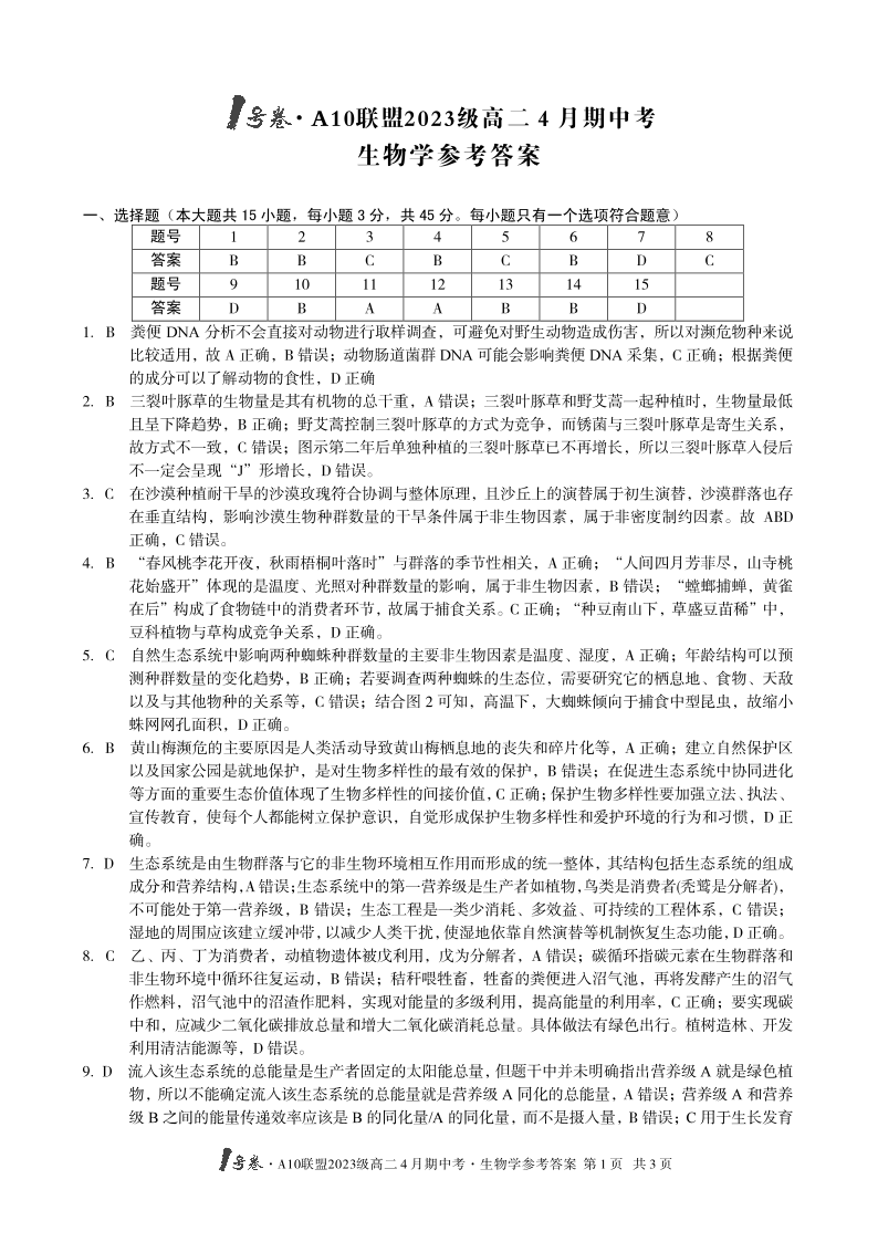 1号卷·A10联盟2023级高二4月期中考 生物答案.pdf