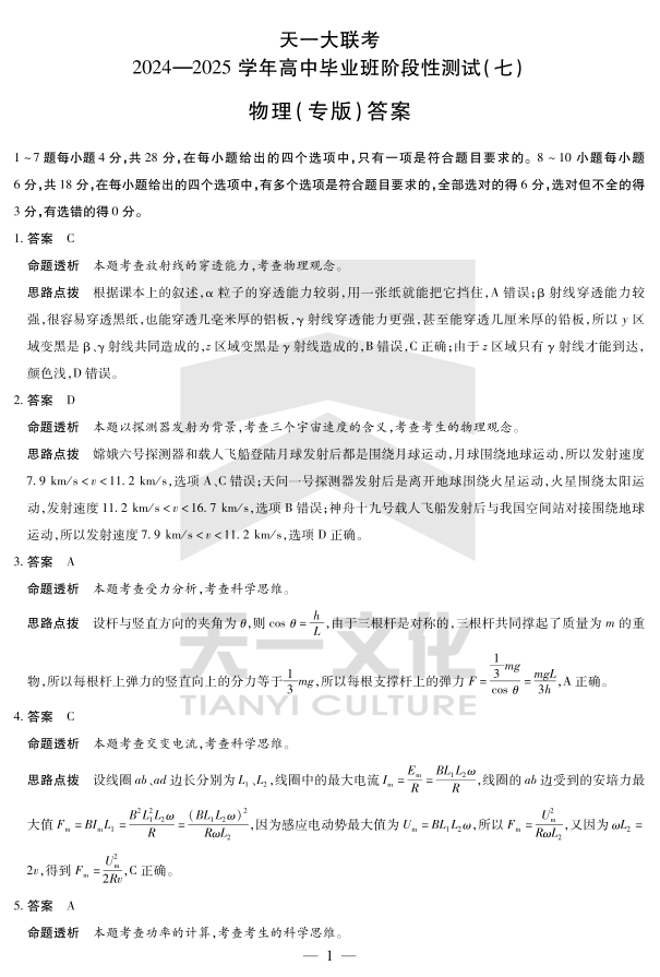 陕西、山西省天一大联考2024-2025学年高中毕业班阶段性测试(七)物理详细答案.pdf