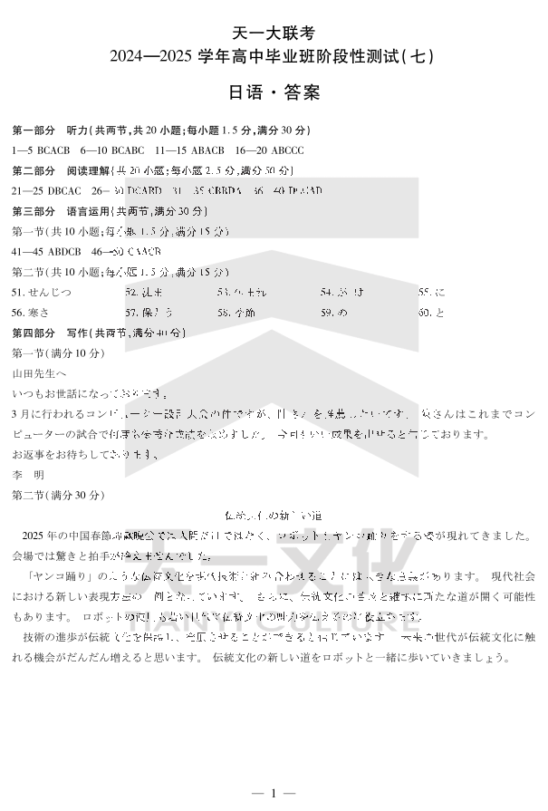 陕西、山西省天一大联考2024-2025学年高中毕业班阶段性测试(七)日语详细答案.pdf