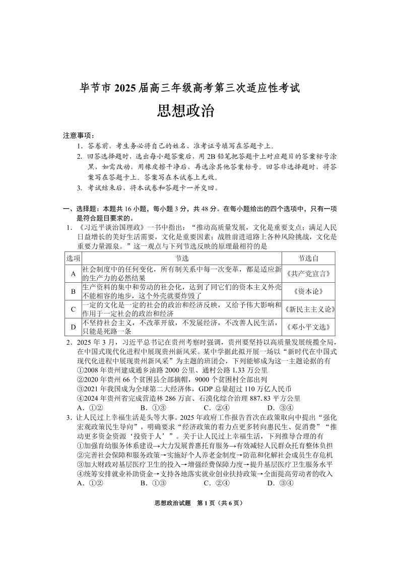 毕节市2025届高三年级高考第三次适应性考试 政治.pdf