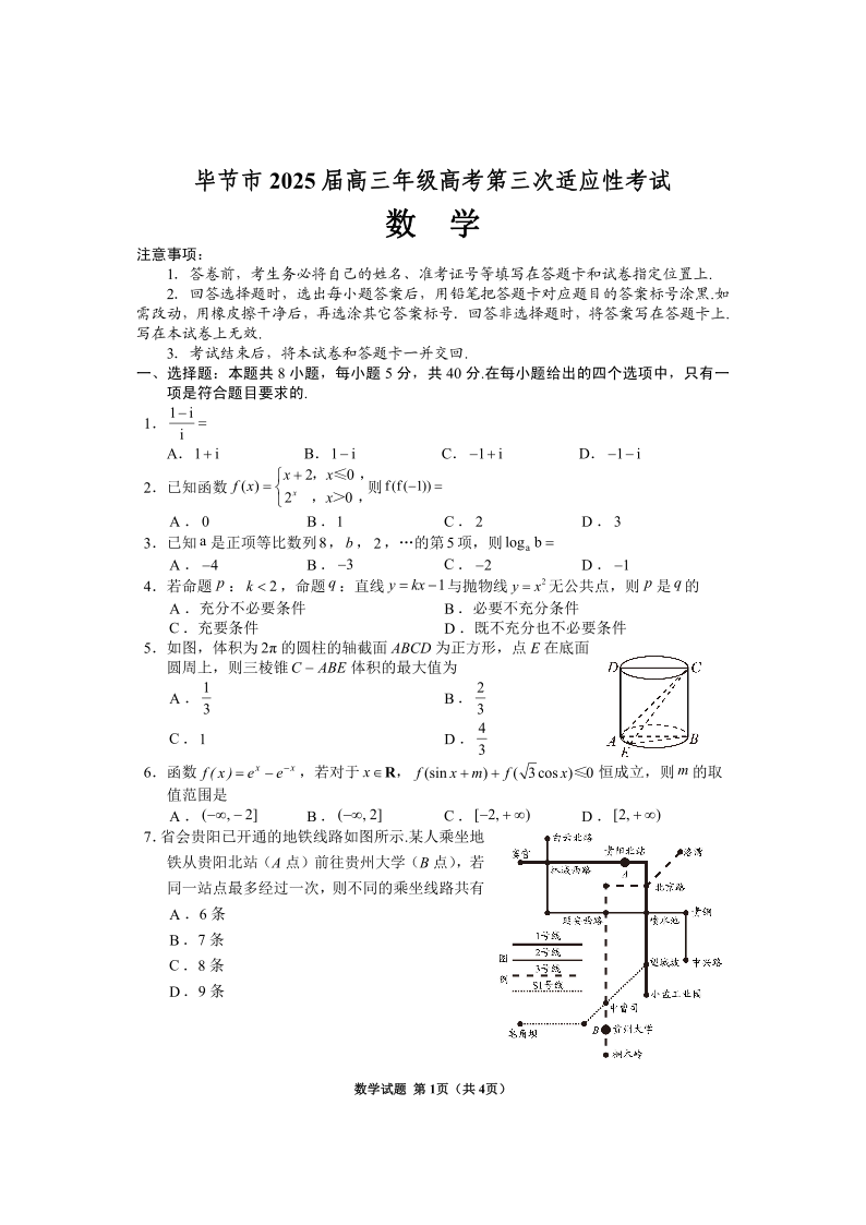 毕节市2025届高三年级高考第三次适应性考试 数学.pdf