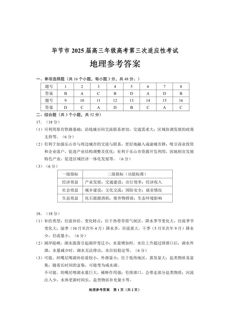 毕节市2025届高三年级高考第三次适应性考试 地理答案.pdf