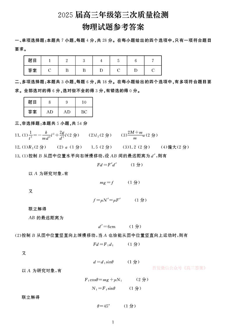 开封市2025届高三年级第三次质量检测 物理答案.pdf