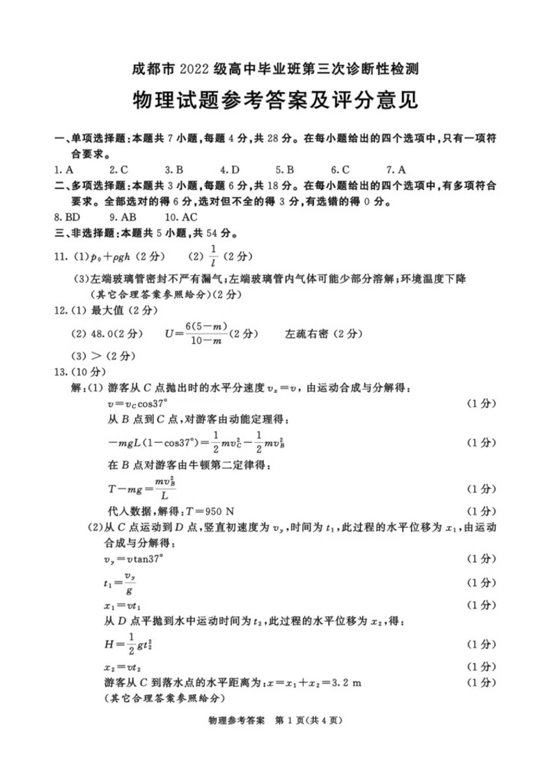 成都市2022级高中毕业班第三次诊断性检测 物理答案.pdf