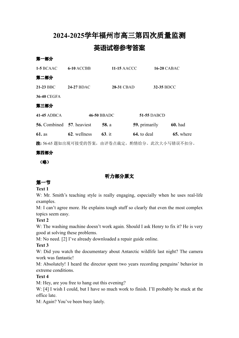 2024-2025学年福州市高三年级第四次质量检测 英语答案.pdf