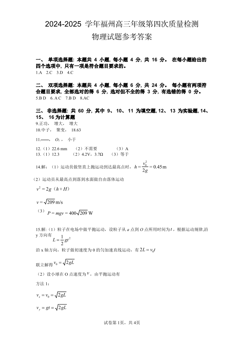 2024-2025学年福州市高三年级第四次质量检测 物理答案.pdf