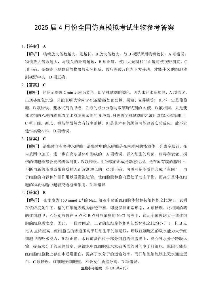 陕西省榆林市2025届4月份高三全国仿真模拟考试 生物答案.pdf