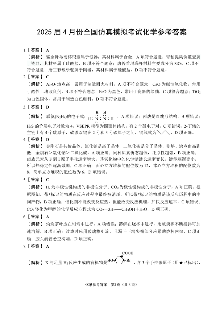 陕西省榆林市2025届4月份高三全国仿真模拟考试 化学答案.pdf