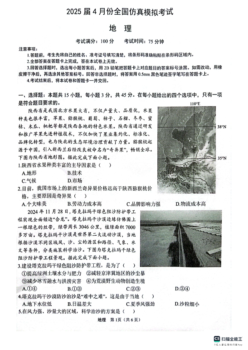 陕西省榆林市2025届4月份高三全国仿真模拟考试 地理.pdf