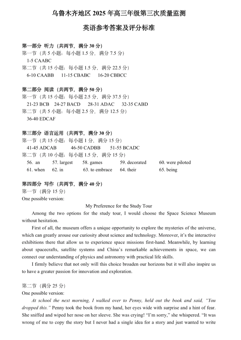 新疆乌鲁木齐地区2025年高三年级第三次质量监测 英语答案.pdf