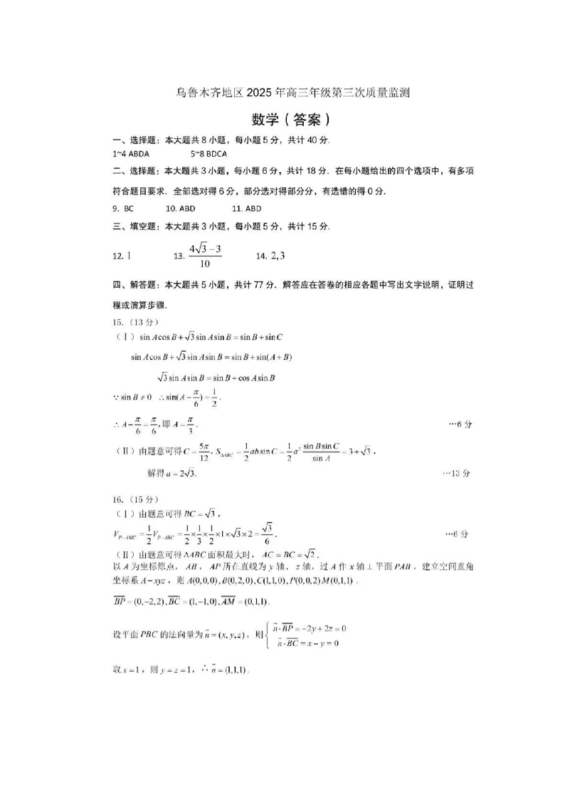新疆乌鲁木齐地区2025年高三年级第三次质量监测 数学答案.pdf