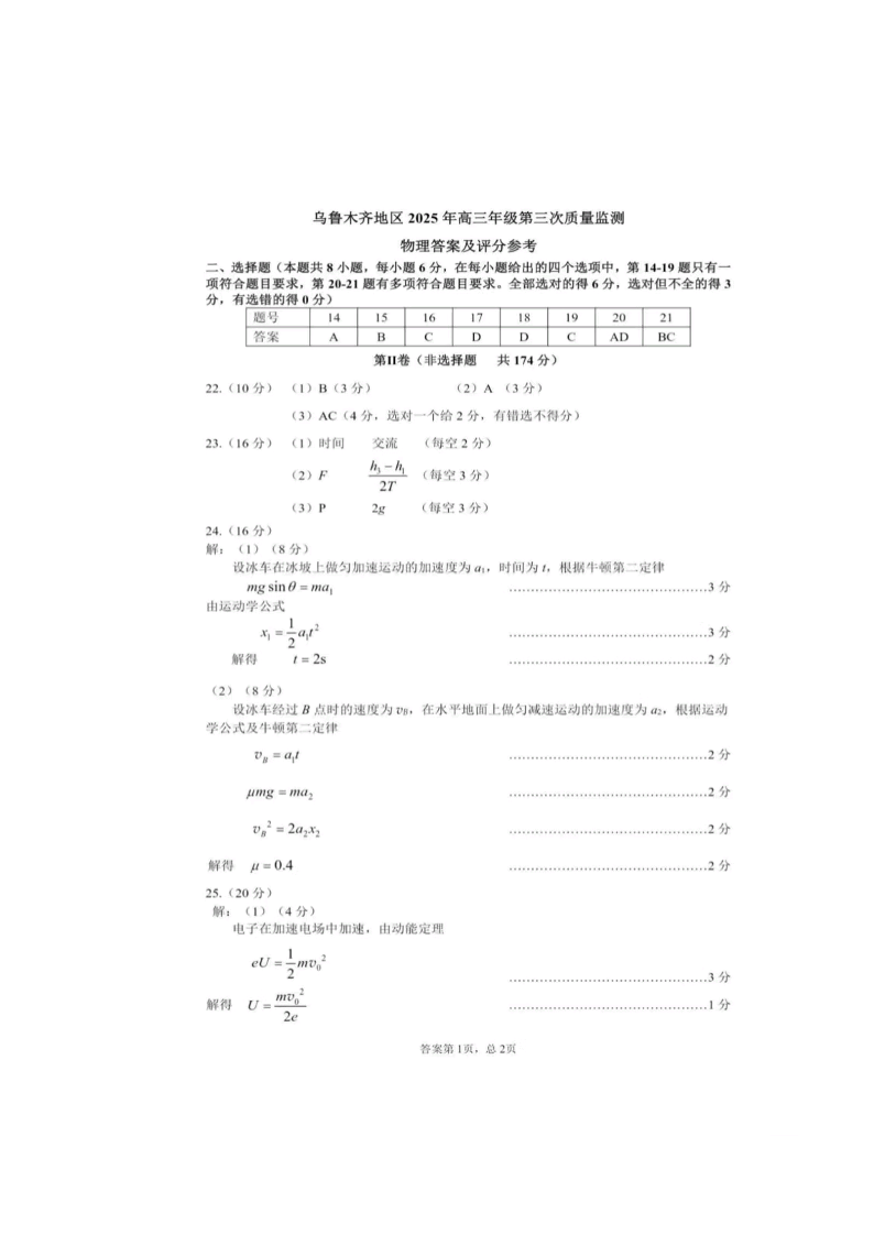 新疆乌鲁木齐地区2025年高三年级第三次质量监测 理综物理答案.pdf