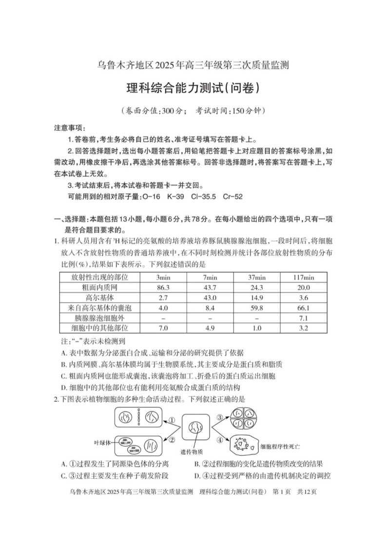 新疆乌鲁木齐地区2025年高三年级第三次质量监测 理综.pdf