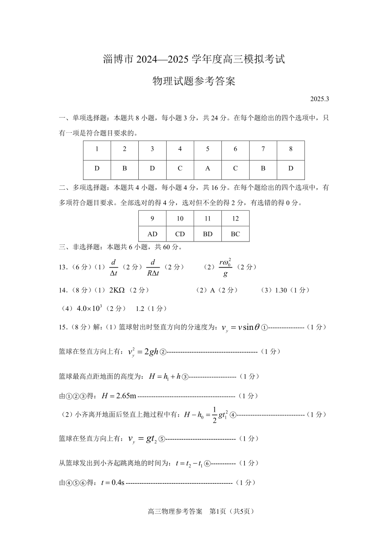 山东省淄博市、滨州市2025届高三模拟考试 物理答案.pdf