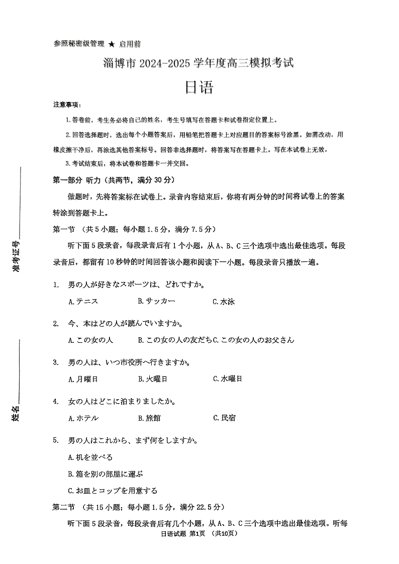山东省淄博市、滨州市2025届高三模拟考试 日语.pdf