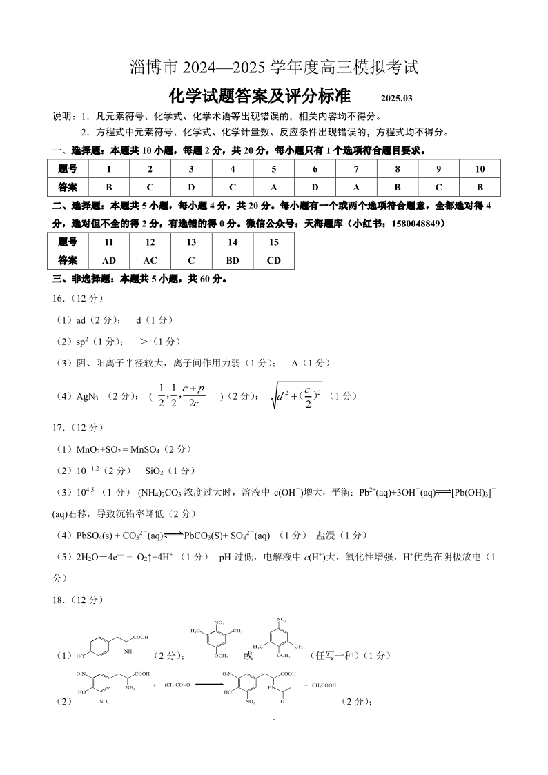 山东省淄博市、滨州市2025届高三模拟考试 化学答案.pdf